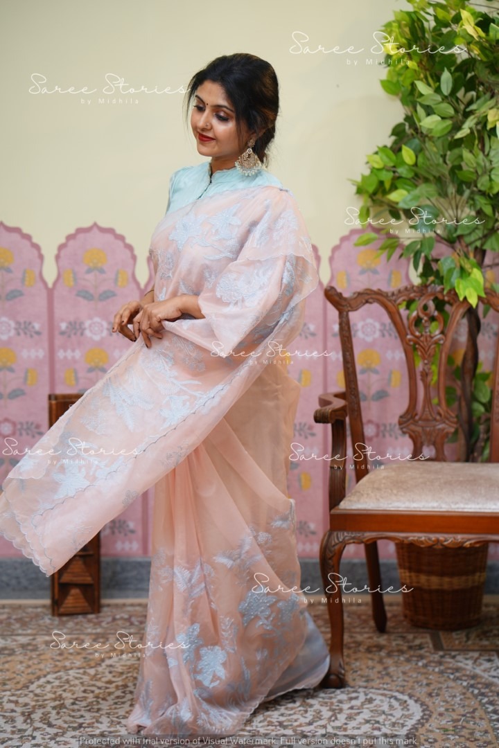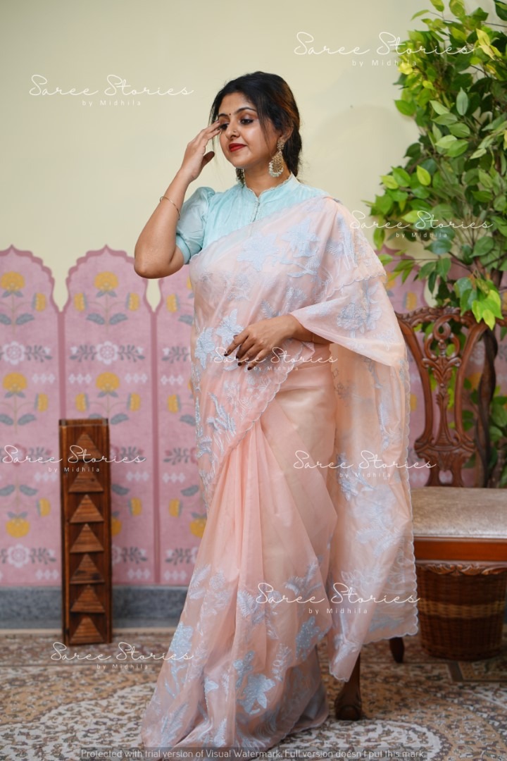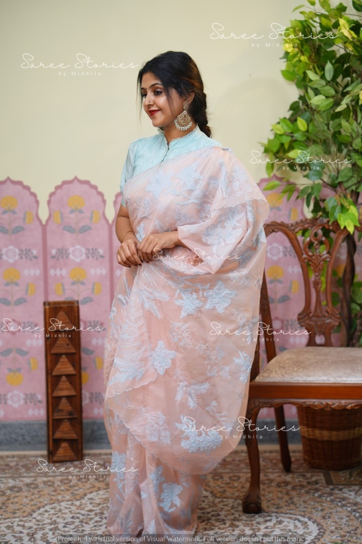 SEMI ORGANZA APPLIQUE SAREE WITH EMBROIDERY AND PEARL WORK WITH BLOUSE MATERIAL