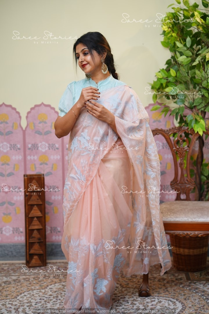 SEMI ORGANZA APPLIQUE SAREE WITH EMBROID...